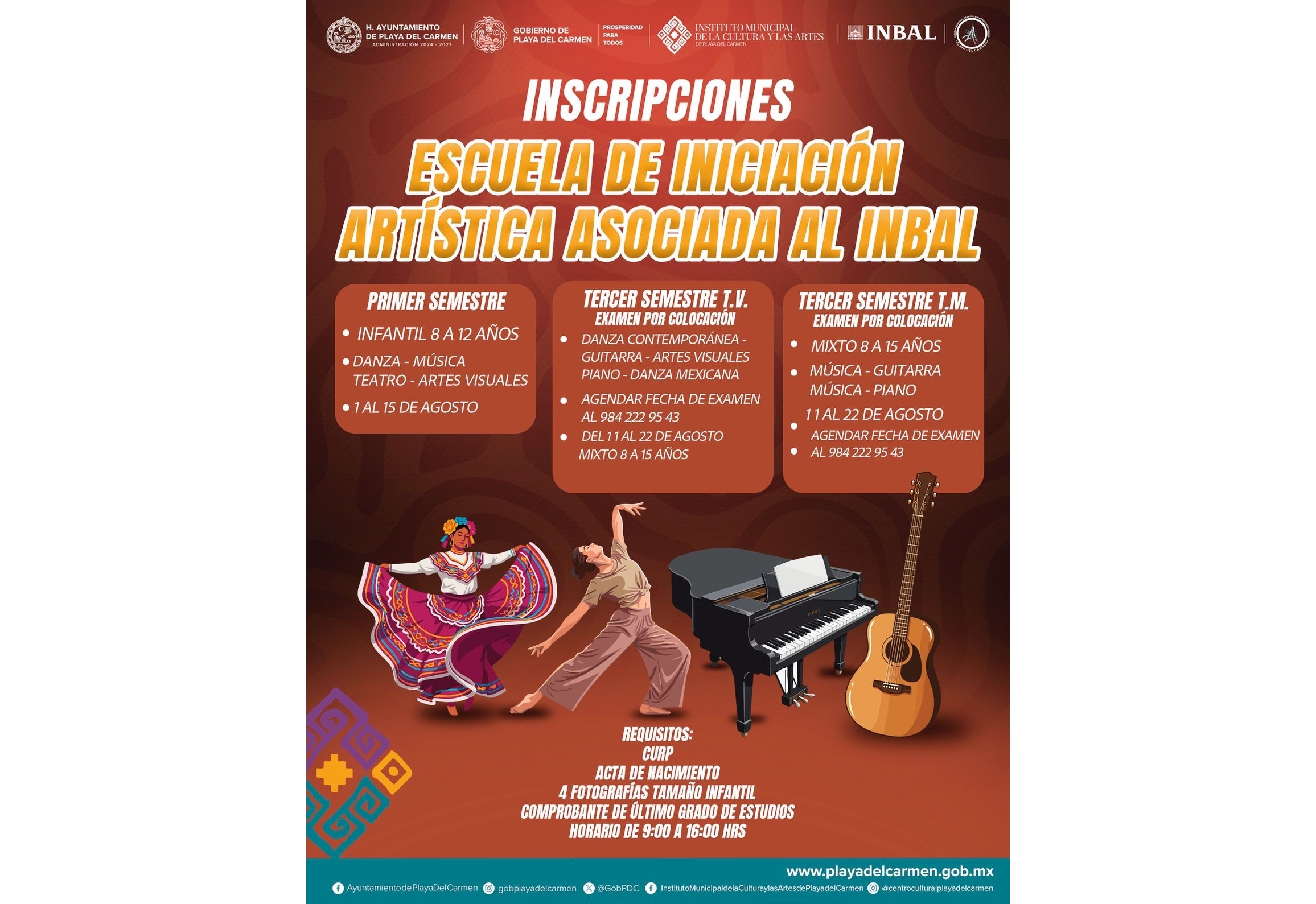 Por lo que toca a los exámenes de colocación de danza mexicana, danza contemporánea, música-guitarra, música-piano, artes visuales y teatro del tercer semestre mixto con educandos de 8 a 15 años de edad en el turno vespertino, deberán acudir al plantel del 11 al 22 de agosto, previa llamada telefónica al 984-222-95-43.
