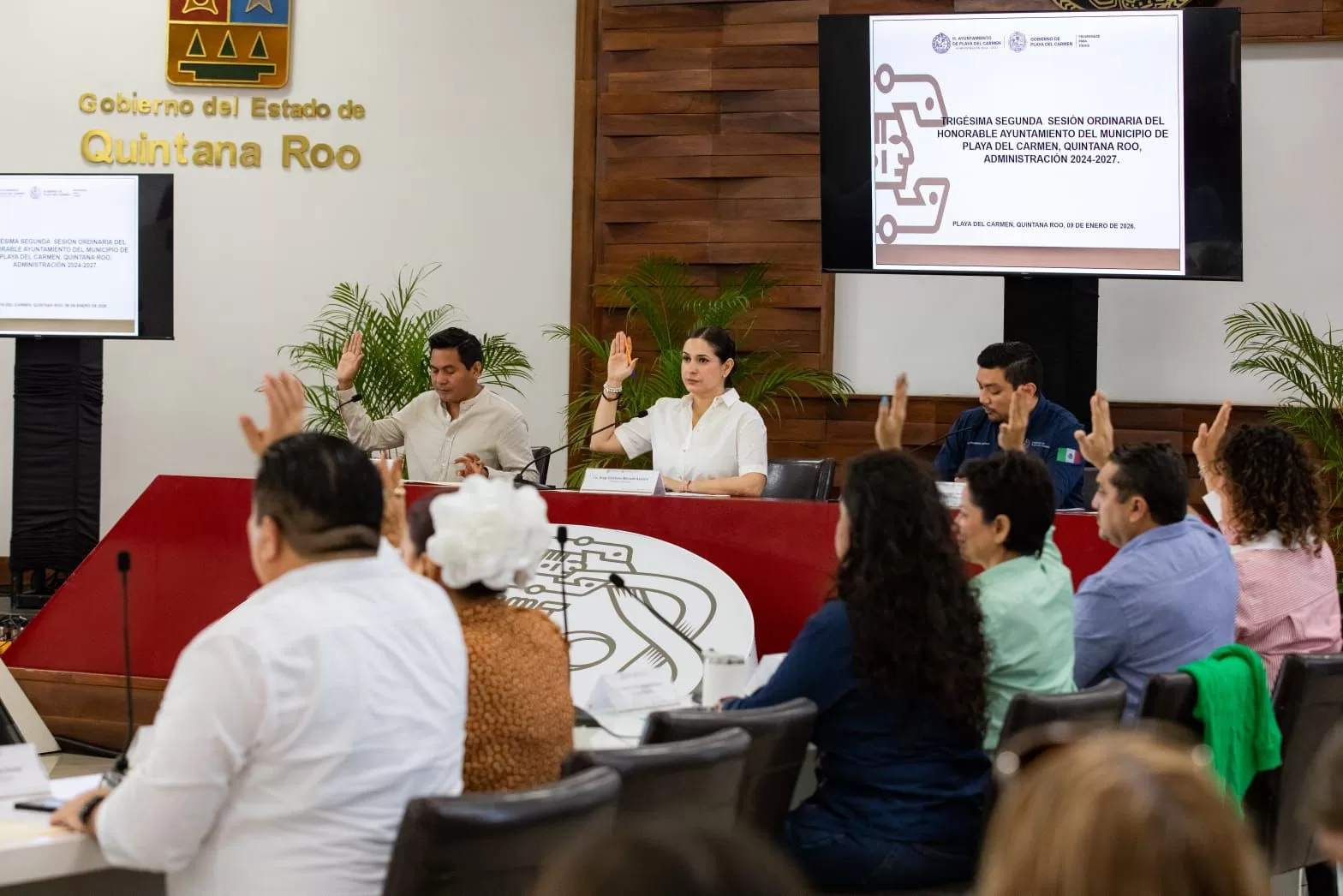 DIANA ALVARADO 08 ENERO 2026.-  La presidenta municipal Estefanía Mercado encabezó la Trigésima Segunda Sesión Ordinaria de Cabildo, en la que fueron aprobadas reformas al párrafo tercero del artículo 10 de la Constitución Política del Estado de Quintana Roo, enviada por la XVIII Legislatura del Congreso del Estado para su validación por los ayuntamientos.