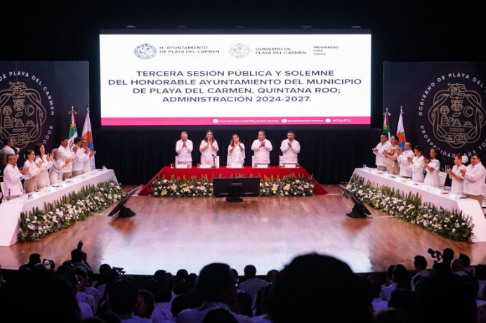 Ante más de 700 invitados reunidos en el Teatro de la Ciudad “Xaman-Ha”, declarado recinto oficial para la sesión de aniversario, Estefanía Mercado destacó que el municipio se ha convertido en el destino con la mayor inversión en seguridad per cápita del país, y ponderó al mismo tiempo la recuperación de espacios públicos, con una nueva identidad visual urbana basada en el color arena, símbolo de pertenencia y orgullo.