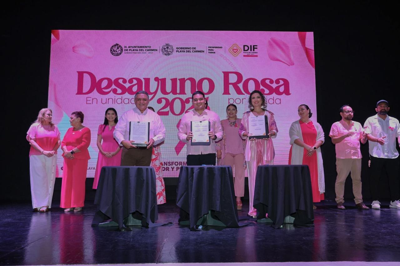 DIANA ALVARADO 17 DE OCTUBRE 2025.— En un emotivo encuentro lleno de esperanza, unión y amor por la vida, el Gobierno de Playa del Carmen, encabezado por la alcaldesa Estefanía Mercado, llevó a cabo, a través del Sistema DIF Municipal, el Desayuno Rosa “En Unidad por la Vida”, un evento con causa que reunió a más de 300 personas para recaudar fondos destinados a estudios de mastografía y fortalecer la detección temprana del cáncer de mama.