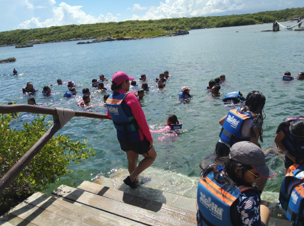 El grupo estuvo compuesto por 57 niñas y niños, así como 4 docentes acompañantes. Durante el recorrido, las y los estudiantes tuvieron la oportunidad de aprender sobre la caleta, una entrada natural del mar hacia la tierra, y sobre la piedra caliza, característica de la región. También conocieron el significado del nombre “Xel-Há”, que en lengua maya se traduce como “orilla del agua”.