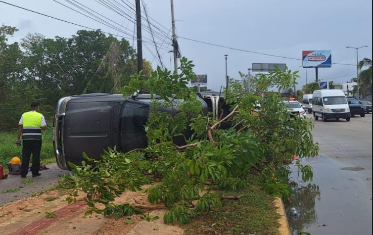 Otra volcadura tuvo lugar en la avenida Antonio Enrique Savignac, en donde un Fiat se estrelló contra el camellón y finalizó volcado en dirección al bulevar Kukulkán.