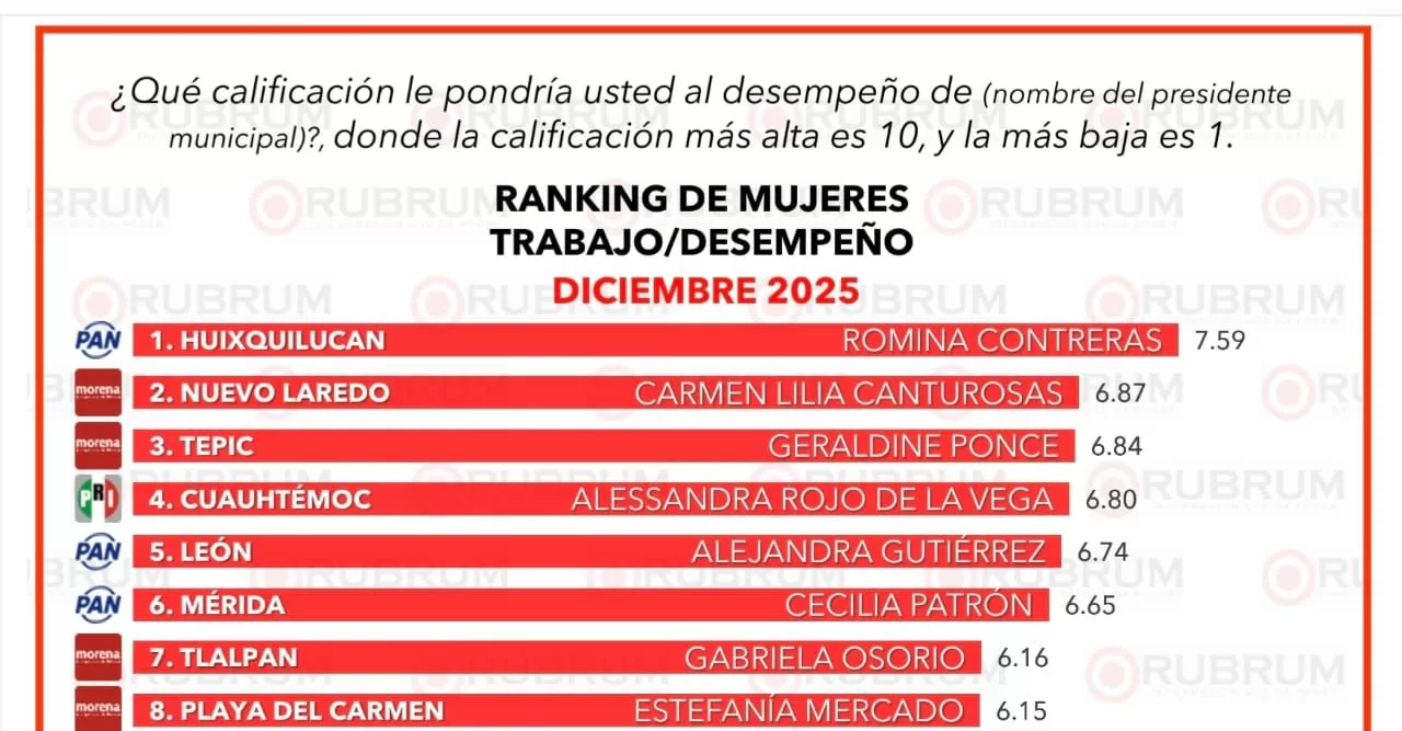 DIANA ALVARADO 12 DE DICIEMBRE 2025.— El estudio Evaluación de Alcaldesas – Rubrum, diciembre 2025 confirma que Estefanía Mercado es la alcaldesa mejor evaluada de todo Quintana Roo, destacando especialmente por la mejora en la percepción de seguridad y por la calidad de los servicios públicos, dos de los indicadores más sensibles para la ciudadanía.