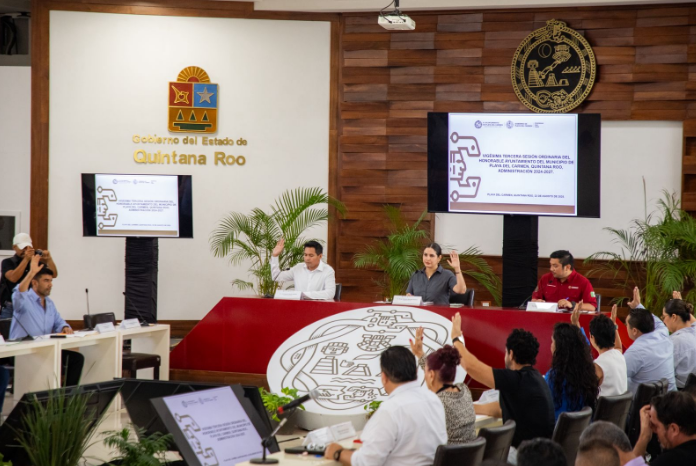 DIANA ALVARADO 22 DE AGOSTO 2025.— La presidenta municipal Estefanía Mercado encabezó la Vigésima Tercera Sesión Ordinaria de Cabildo, en la que se aprobó por unanimidad la utilización del color “Arena Playa” como distintivo oficial y representativo de la identidad social, cultural y territorial del municipio. Con esta decisión, Playa del Carmen deja atrás la práctica de imponer colores partidistas en la infraestructura pública y consolida un símbolo propio y permanente para la ciudad.