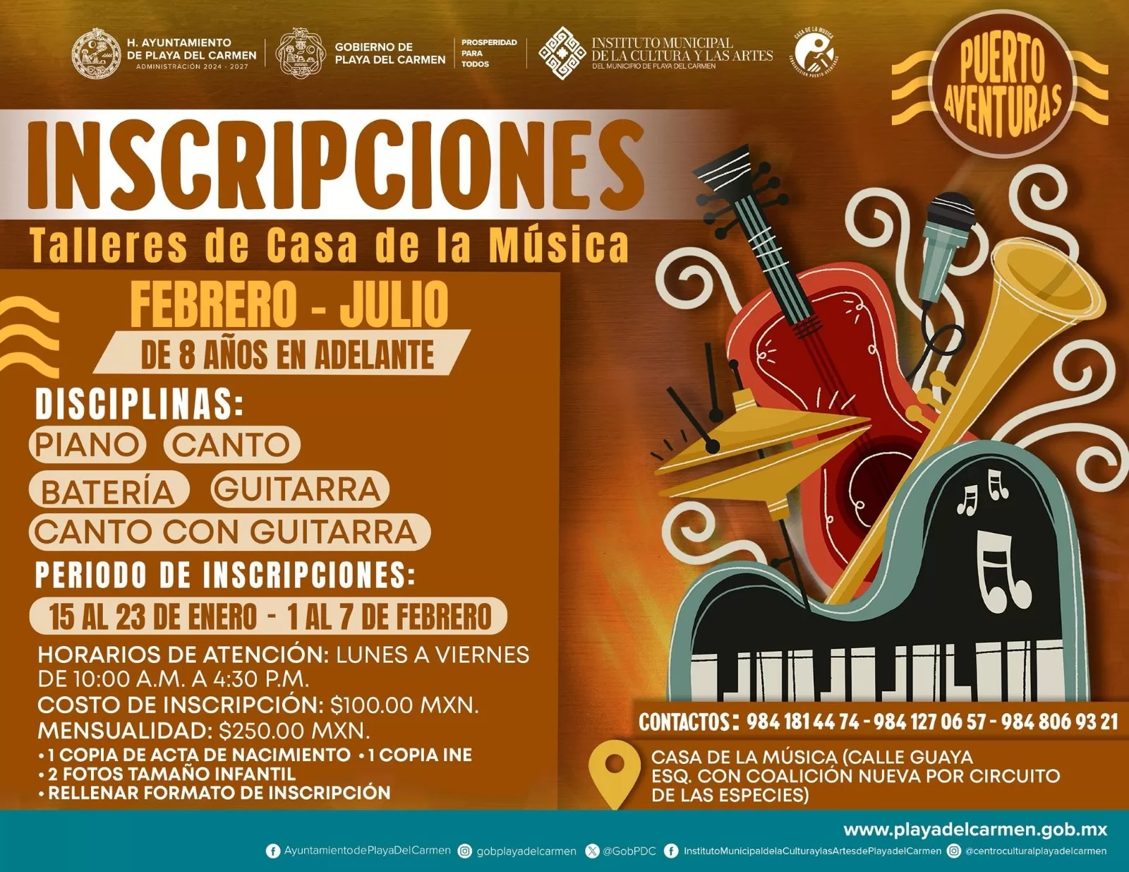 La Casa de la Música en la alcaldía de Puerto Aventuras ofrece los talleres de canto con guitarra, piano, batería y guitarra. Las inscripciones serán del 1 al 7 de febrero de 10 de la mañana a 4:30 de la tarde. Número de atención Whatsapp: 984-1814474, 984-8069321 y 984-1270657. Más información: https://acortar.link/mktq4K