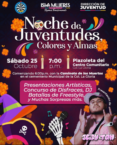 DIANA ALVARADO 20 DE OCTUBRE 2025.— El Gobierno de Isla Mujeres, encabezado por la Presidenta Municipal, Atenea Gómez Ricalde, invita a toda la comunidad a la gran “Noche de Juventudes: Colores y Almas”, que se realizará el sábado 25 de octubre a las 18:00 horas en la Plazoleta del Centro Comunitario de la Colonia La Gloria.