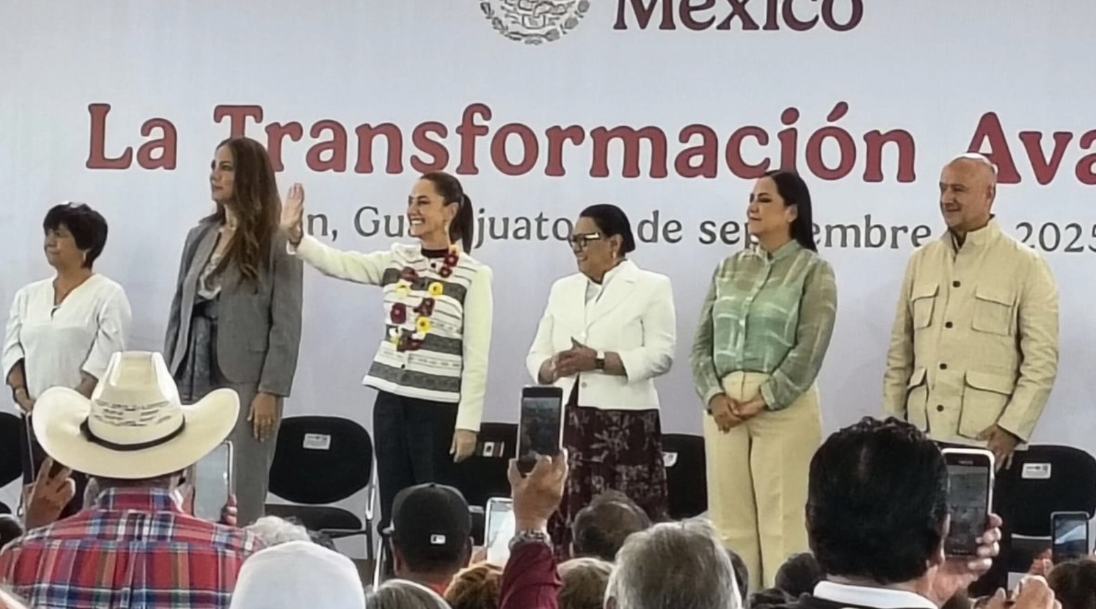 DIANA ALVARADO 05 DE SEPTIEMBRE 2025.— El gobierno de México y el de Guanajuato no coinciden en algunos temas y son de partidos políticos diferentes, pero sus titulares gobiernan juntas y coordinadas; acción que se refleja con la disminución de un 60 por ciento en los homicidios dolosos, señaló la presidenta, Claudia Sheinbaum Pardo, en el informe que rindió en la ciudad de León, acompañada por la gobernadora, Libia García Muñoz Ledo.