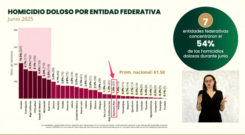 DIANA ALVARADO 08 DE JULIO 2025.— Los homicidios dolosos en Quintana Roo han tenido una reducción de más del 50% en Quintana Roo, entre el primer semestre de 2024 y de este año, de acuerdo a datos del Secretariado Ejecutivo de Seguridad Pública, presentados este día en la conferencia matutina de la presidenta Claudia Sheinbaum Pardo.
