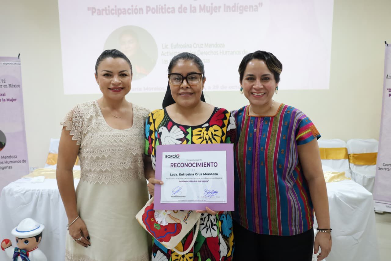 DIANA ALVARADO 29 DE OCTUBRE 2025.— En el marco del 72 Aniversario del Voto Femenino en México, el Instituto Electoral de Quintana Roo (IEQROO) realizó la Conferencia Magistral “Participación Política de la Mujer Indígena”, impartida por la destacada activista y defensora de derechos humanos, Eufrosina Cruz Mendoza.