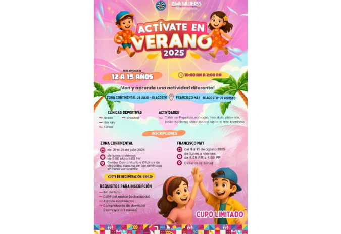 DIANA ALVARADO 21 DE JULIO 2025.— El Gobierno Municipal de Isla Mujeres, que encabeza la alcaldesa Atenea Gómez Ricalde, informa a las madres y padres de familia que ya iniciaron las inscripciones para los cursos “Actívate en Verano 2025” y “Baaxlo’ob Paalalo’ob”, dirigidos a niñas, niños y jóvenes de 6 a 15 años de edad.