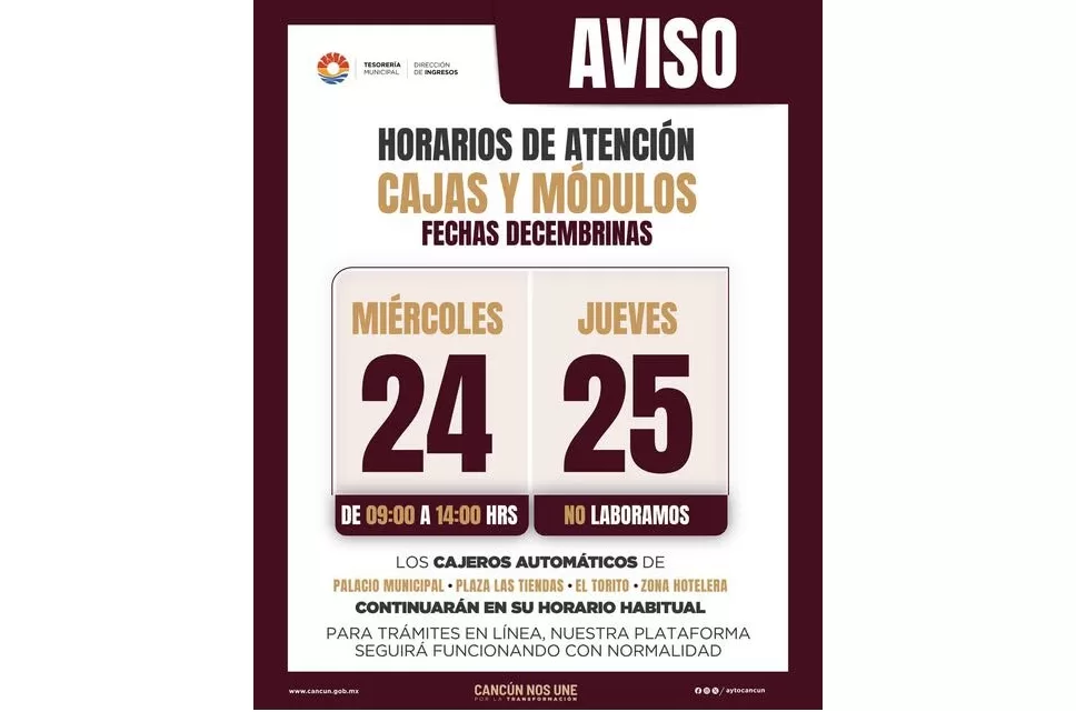 DIANA ALVARADO 23 DE DICIEMBRE 2025.— Con motivo del asueto por la celebración de Navidad, este jueves 25 de noviembre, la Tesorería Municipal y la Dirección de Ingresos del Ayuntamiento de Benito Juárez, informan a los contribuyentes que se mantendrán cerradas todas sus cajas y módulos, pero estarán disponibles otros mecanismos para el cumplimiento de sus contribuciones.