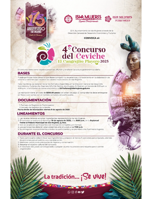 El 4to. Concurso del Ceviche se realizará el domingo 10 de agosto a las 20:00 horas, en la Explanada Municipal. Pueden participar todas las personas que deseen compartir su receta o variante de ceviche elaborada con ingredientes representativos de Isla Mujeres.