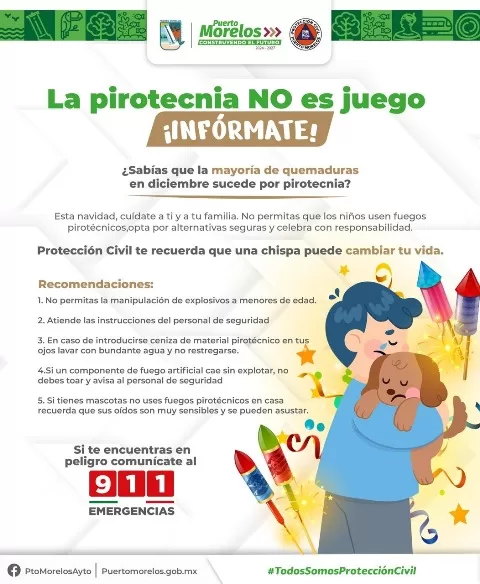 En este contexto, el gobierno municipal lanzó la campaña “La pirotecnia no es un juego”, con la que se busca concientizar sobre los riesgos asociados al uso de fuegos artificiales. Protección Civil recuerda que la mayoría de las quemaduras que se registran en diciembre están relacionadas con la pirotecnia y advierte que una chispa puede cambiar la vida de una persona, por lo que invita a cuidar de las familias y evitar que niñas y niños manipulen estos productos, promoviendo celebraciones seguras y responsables.