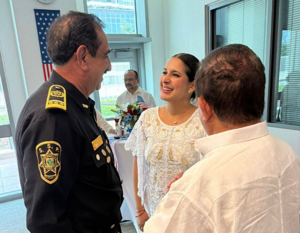 DIANA ALVARADO 27 DE JUNIO 2025.— En el marco de la celebración del Día de la Independencia de los Estados Unidos, en el Consulado en Mérida, la presidenta municipal de Playa del Carmen, Estefanía Mercado, sostuvo un encuentro con el secretario de Seguridad Pública de Yucatán, Luis Felipe Saidén Ojeda, con quien dialogó sobre los avances en seguridad que se están logrando en el municipio y las buenas prácticas que han hecho de Yucatán, un referente nacional en la materia.